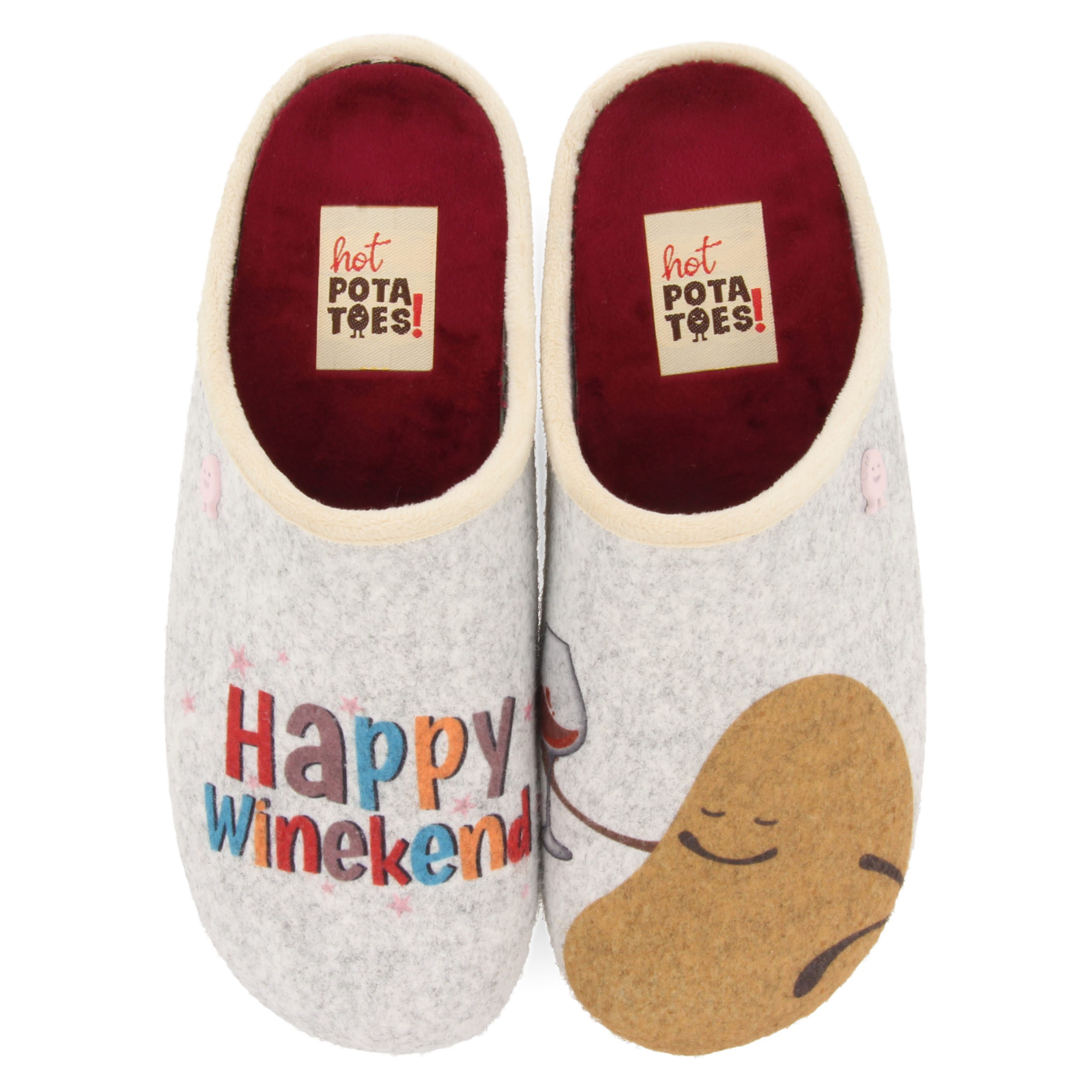 Is het al wine.. Uh, weekend? Het maakt niet uit, met deze Hot Potatoes mag je altijd aan de wijn. Rood, wit of een lekker roseetje, jij bent de moeilijkste niet. Nodig je vriendinnen uit voor een gezellig avondje. Enige vereiste: wijn en Hot Potatoes! – Hot Potatoes pantoffel voor dames. Comfortabel en Made in Spain. Vervaardigd van polyester en de zool is van natuurlijk rubber met gerecyclede kunststof snippers. Met uitneembare inlegzool van 100% gerecycled PU. Hot Potatoes zijn koud wasbaar.